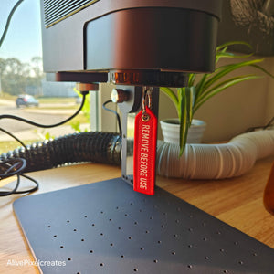High quality embroider tag with a really strong ring and double sided anker to attach to your lens cap, REMOVE BEFORE USE message to always remember to take your lens cap off and have a worry-free lasering experience.